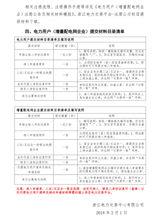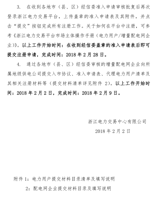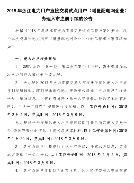 此外,浙江電力交易中心還發(fā)布了《2018年浙江電力用戶直接交易試點(diǎn)用戶(增量配電網(wǎng)企業(yè))辦理入市注冊(cè)手續(xù)的公告》,35KV及以上第一類、第二類工商企業(yè)用戶,需全部參加本次電力用戶入市注冊(cè)手續(xù)辦理。