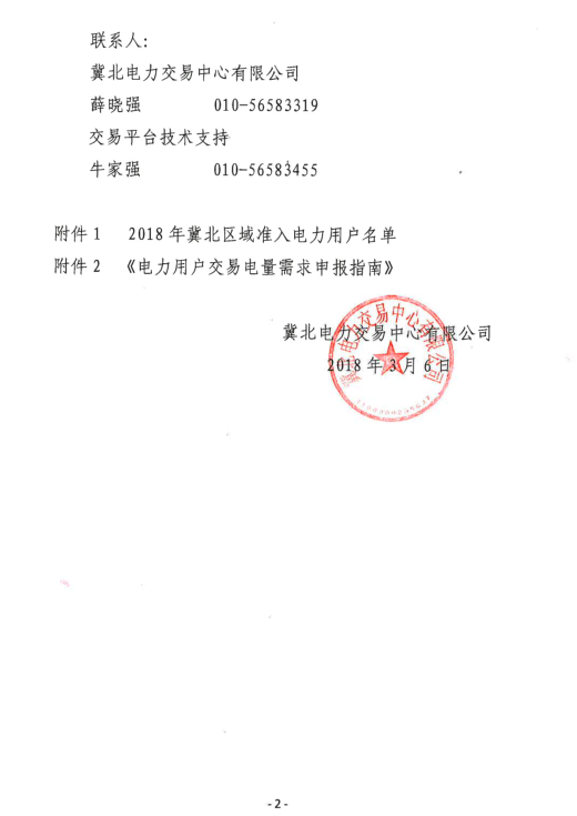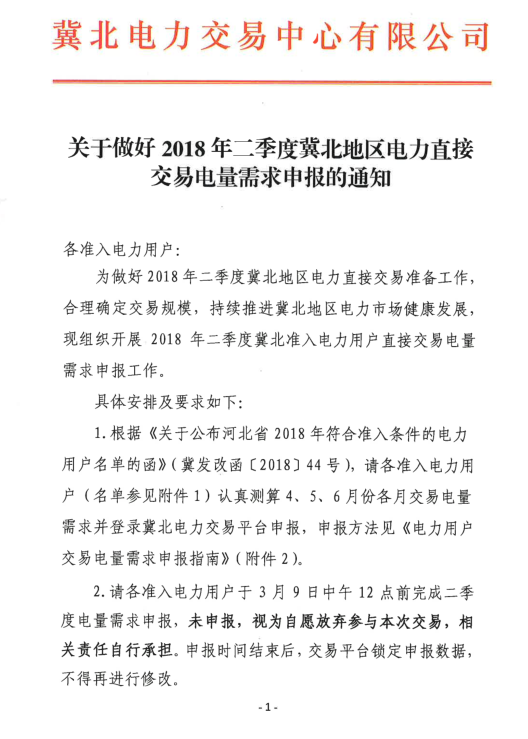 二季度冀北地區(qū)電力直接交易電量需求開始申報(bào)(附電力用戶名單)