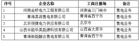 青海公示5家業(yè)務(wù)范圍變更的售電公司