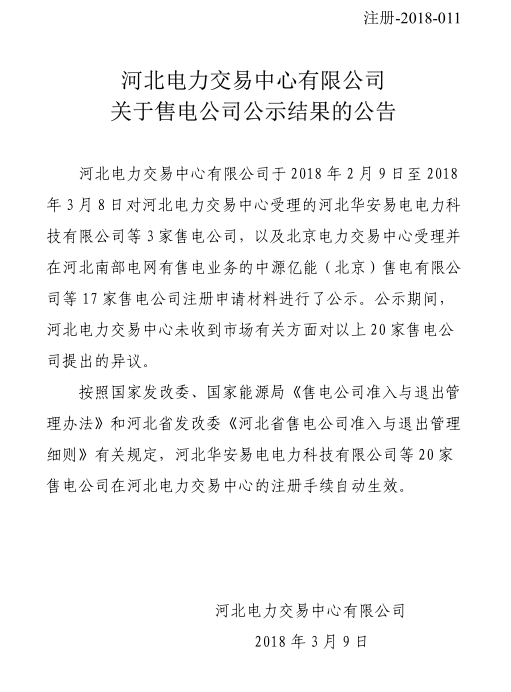 河北電力交易中心日前發(fā)布了關于售電公司公示結果的公告,公告中稱,公示期間未收到20家售電公司的異議,注冊手續(xù)自動生效。詳情如下: