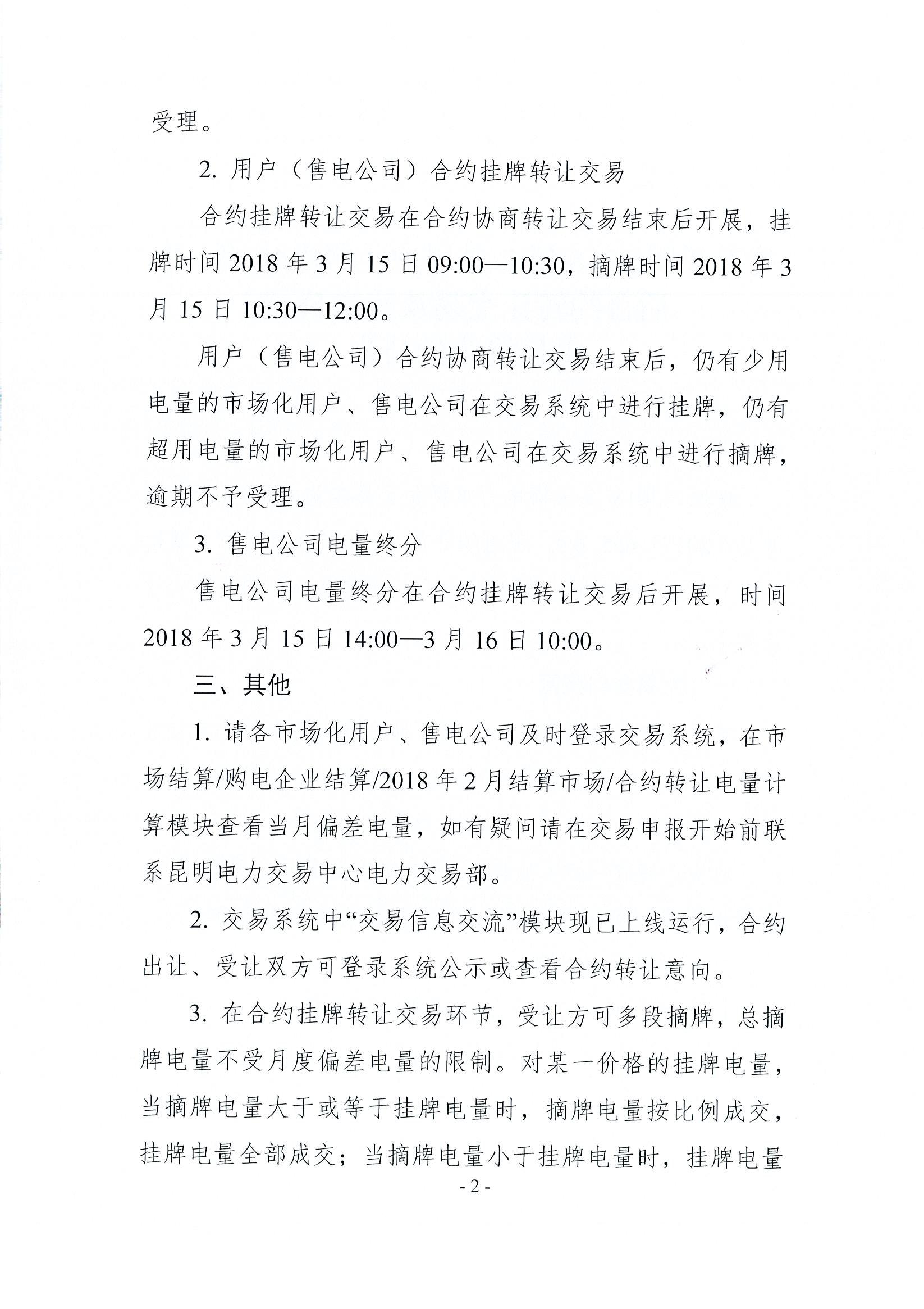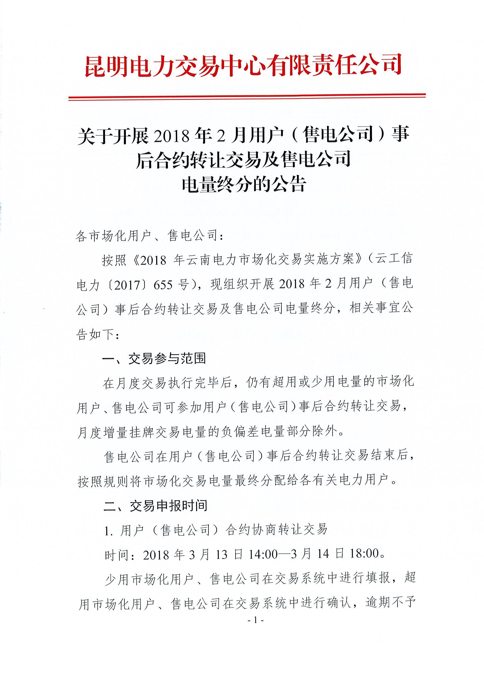 云南關(guān)于開展2018年2月用戶(售電公司)事后合約轉(zhuǎn)讓交易及售電公司電量終分的公告