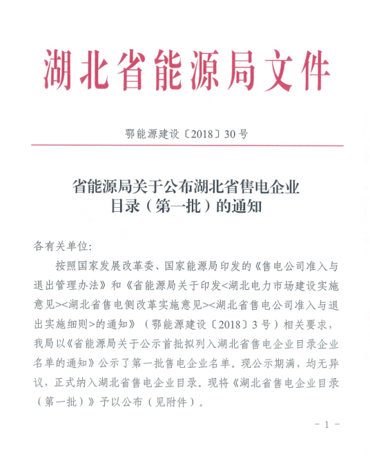 省能源局關(guān)于公布湖北省售電企業(yè)目錄(第一批)的通知
