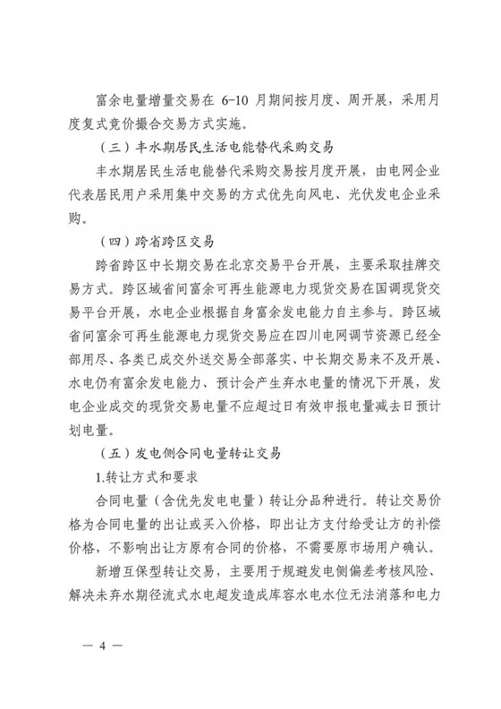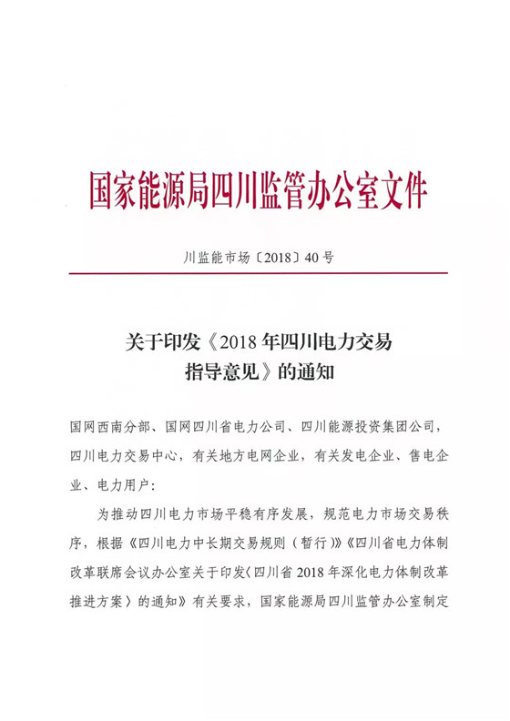 國家能源局四川監(jiān)管辦日前發(fā)布了關(guān)于印發(fā)《2018年四川電力交易指導(dǎo)意見》的通知,通知明確了2018年四川市場交易品種,包括電力直接交易、跨省跨區(qū)交易(含跨區(qū)域省間富余可再生能源電力現(xiàn)貨交易)、富余電量增量交易、豐水期居民生活電能替代采購交易、發(fā)電側(cè)合同電量轉(zhuǎn)讓交易、偏差電量調(diào)整交易和輔助服務(wù)交易等。