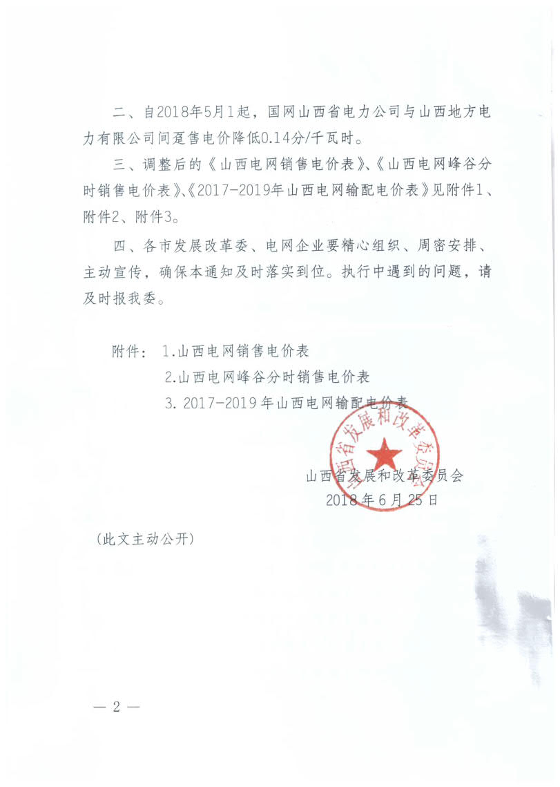 自2018年5月1日起,國網(wǎng)山西省電力公司與山西地方電力有限公司間躉售電價(jià)降低0.14分/千瓦時(shí)。