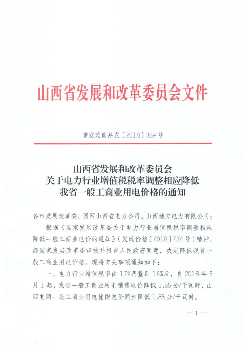 山西省發(fā)改委日前發(fā)布了《關(guān)于電力行業(yè)增值稅稅率調(diào)整相應(yīng)降低我省一般工商業(yè)用電價(jià)格的通知》,自2018年5月1日起,山西省一般工商業(yè)用電銷...
