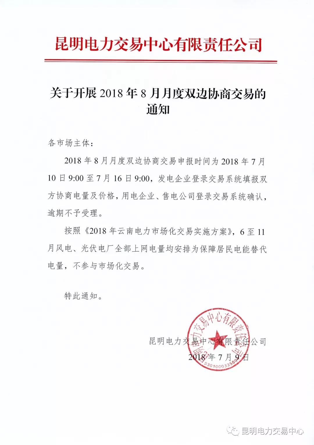 云南關(guān)于開展2018年8月月度雙邊協(xié)商交易的通知