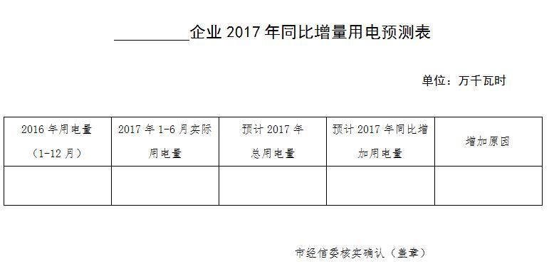 五、各縣(市、區(qū))經(jīng)信局要認真組織企業(yè),根據(jù)年內(nèi)生產(chǎn)安排和項目投運情況,實事求是地做好年度用電預測工作,并組織符合條件的企業(yè)填寫年度增量用電預測表,務于7月11日前將屬地內(nèi)電力用戶增量用電情況以正式文件報市經(jīng)信委。