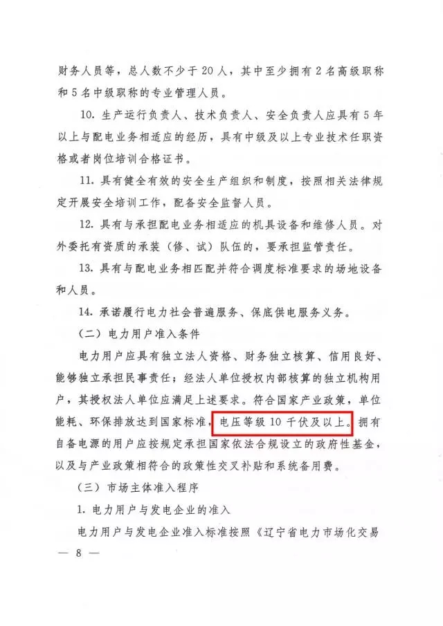 一般電力用戶的準入標準為電力等級10千伏及以上。