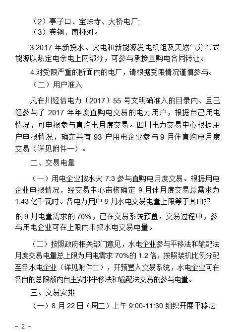 四川開展2017年9月直購電月度交易公告