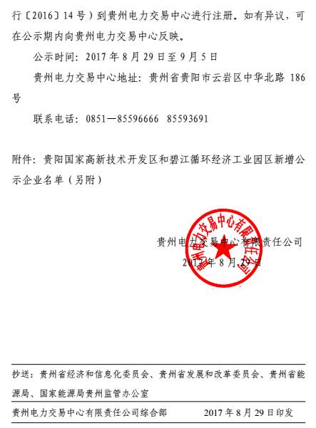 從貴州電力交易中心獲悉,貴州電力交易中心日前發(fā)布了關(guān)于將貴陽(yáng)國(guó)家高新技術(shù)開發(fā)區(qū)和碧江循環(huán)經(jīng)濟(jì)工業(yè)園區(qū)新增企業(yè)名單進(jìn)行公示的通知。本次符合電力市場(chǎng)化交易條件的共2個(gè)試點(diǎn)工業(yè)園區(qū)內(nèi)19家企業(yè),公示時(shí)間2017年8月29日至9月5日。具體公告如下:
