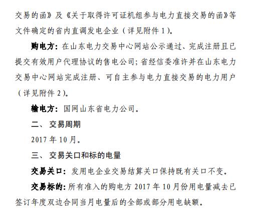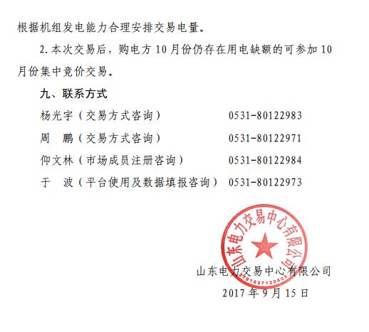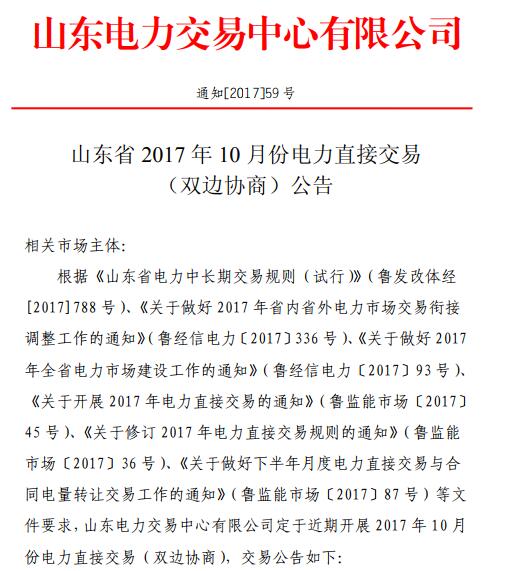 2017年9月15日,山東電力交易中心發(fā)布《山東省2017年10月份電力直接交易(雙邊協商)公告》。山東將于2017年9月18日14:00-17:00開展2017年10月份電力直接交易,交易結束后,購電方10月份仍存在用電缺額的可參加1