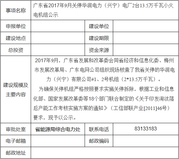 ,近日,廣東省發(fā)改委發(fā)布了2017年9月關(guān)停華潤(rùn)電力(興寧)電廠2臺(tái)13 5萬(wàn)千瓦小火電機(jī)組公示,詳情如下:本公示的期限為9月19日至9月25日。公民、法人和其他經(jīng)濟(jì)組織在公示期限屆滿(mǎn)后五個(gè)工作日內(nèi),對(duì)本行政審批事