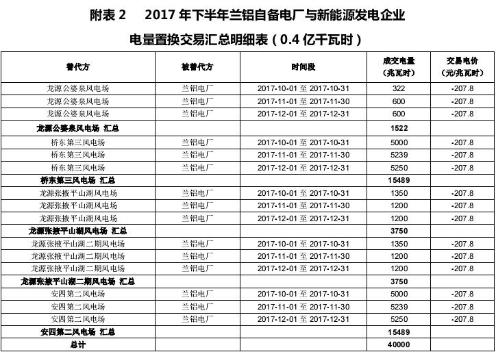 2億千瓦時(shí)!2017年甘肅省火電、新能源發(fā)電企業(yè)與中國鋁業(yè)蘭州分公司自備電廠電量置換交易結(jié)果公布!