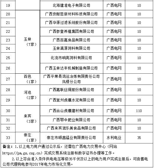 關于擬列入2017年廣西電力市場化交易電力用戶準入名單(第十批)的公示