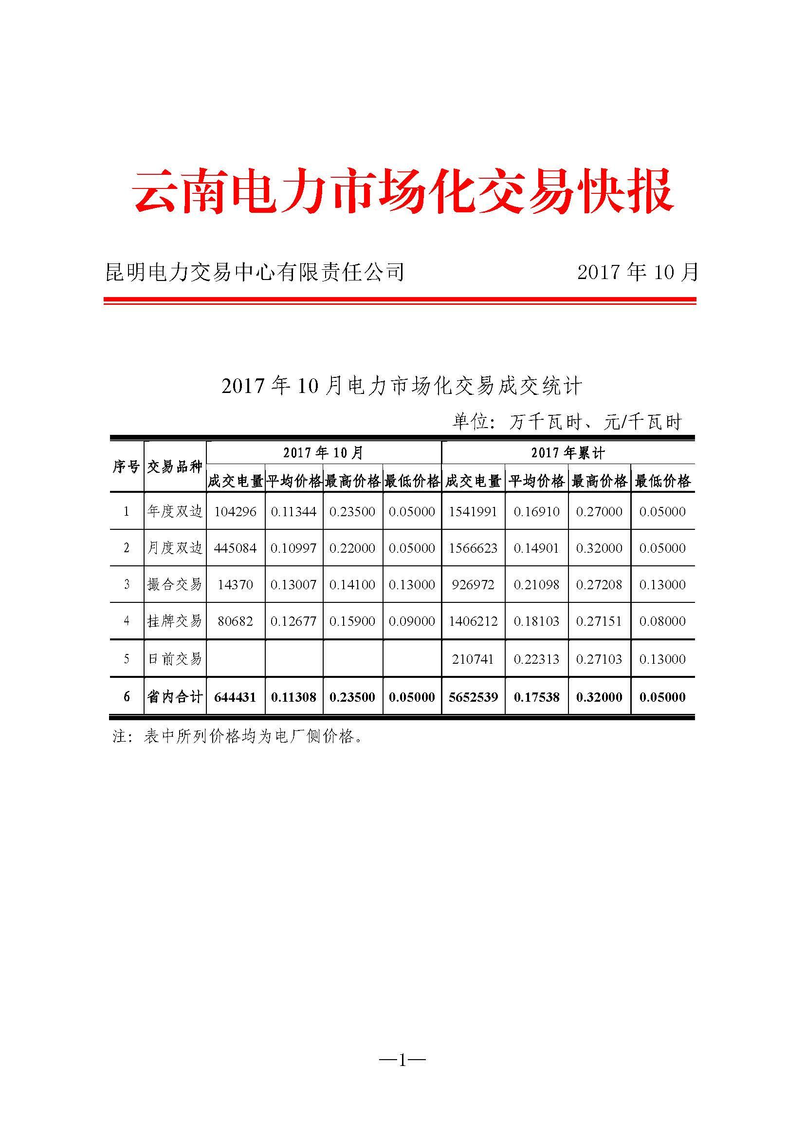 云南電力市場化交易快報(2017年10月)
