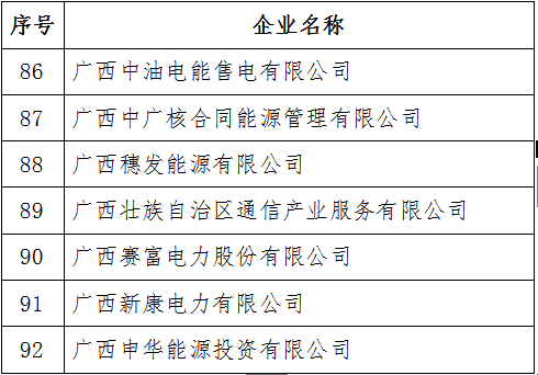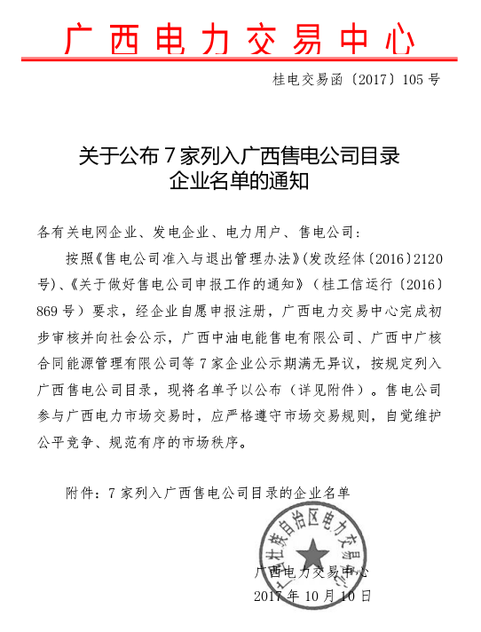 2017年10月10日,廣西中油電能售電有限公司、廣西中廣核合同能源管理有限公司等7家企業(yè)公示期滿(mǎn)無(wú)異議,按規(guī)定列入廣西售電公司目錄。