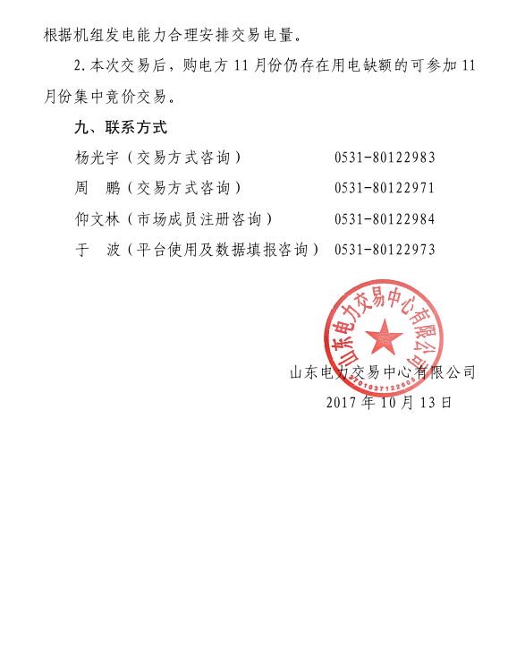 2017年10月13日山東電力交易中心發(fā)布11月份電力直接交易(雙邊協(xié)商)公告。將于2017年10月17日8:50-11:50組織雙邊協(xié)商交易,交易標(biāo)的為所有準(zhǔn)入的購(gòu)電方2017年11月份用電量減去已簽訂年度雙邊合同當(dāng)月電量后的全