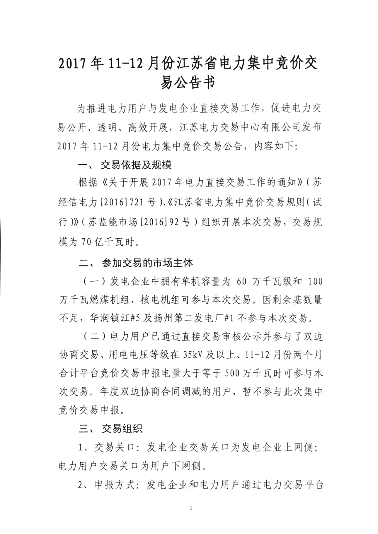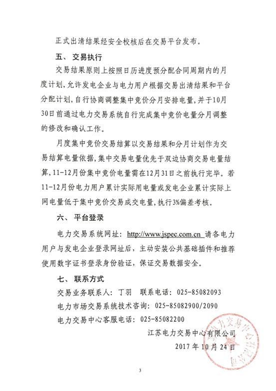 2017年11至12月份江蘇省電力集中競(jìng)價(jià)交易公告書