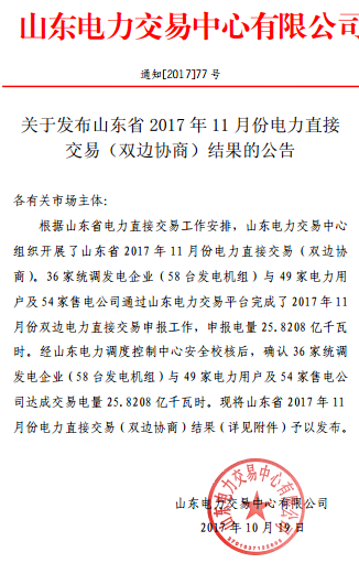 山東發(fā)布2017年11月份電力直接交易(雙邊協(xié)商)結(jié)果的公告