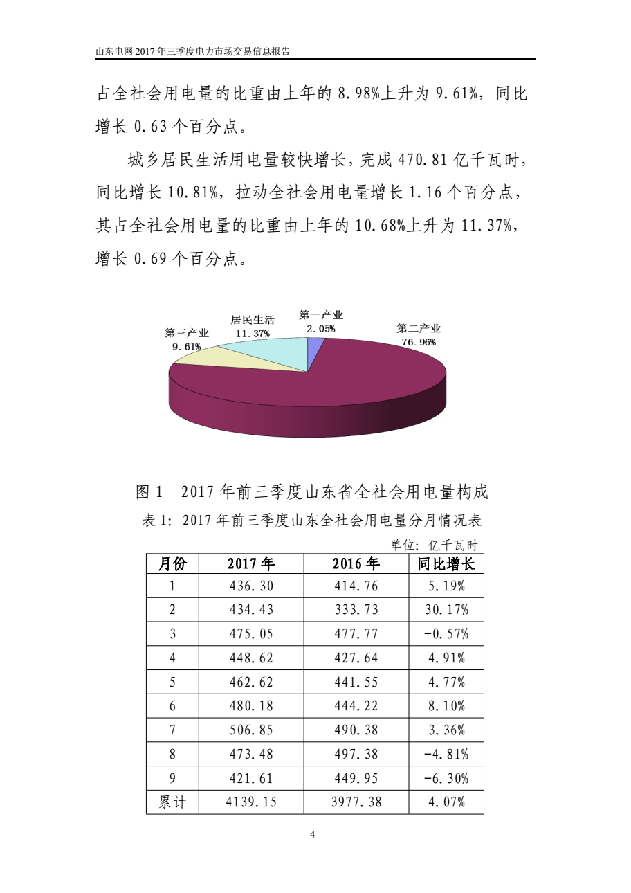 山東電力交易中心日前發(fā)布了《山東電網(wǎng)2017年三季度電力市場(chǎng)交易信息報(bào)告》,報(bào)告中稱,前三季度,全省全社會(huì)用電量完成 4139.15 億千瓦時(shí),同比增長(zhǎng) 4.07%。