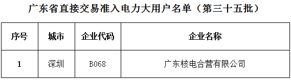 廣東省經(jīng)信委日前下發(fā)了《第三十五批直接交易準(zhǔn)入電力大用戶名單》。廣東核電合營有限公司電力大用戶符合與發(fā)電企業(yè)直接交易擴(kuò)大試點準(zhǔn)入條件,詳情如下: