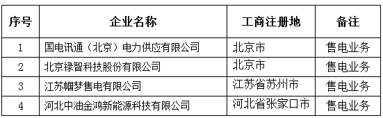 按照國家發(fā)改委、國家能源局《售電公司準(zhǔn)入與退出管理辦法》(發(fā)改經(jīng)體〔2016〕2120號)的要求,青海電力交易中心有限公司受理了北京電力交易中心有限公司推送的國電訊通(北京)電力供應(yīng)有限公司等4家售電公司的市場注冊申請,現(xiàn)將企業(yè)名單及基本情況予以公示。