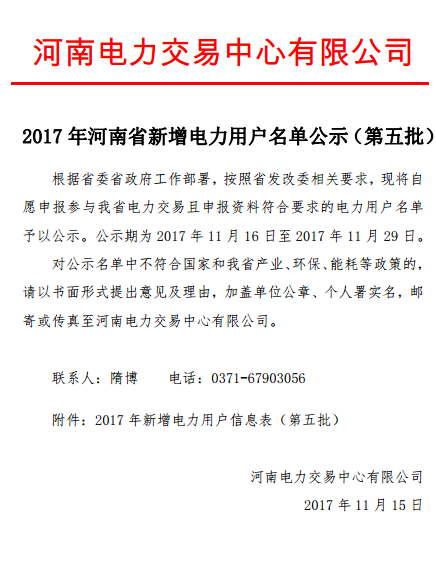 11月15日,河南電力交易中心發(fā)布了《2017 年河南省新增電力用戶名單公示(第五批)》,共計(jì)311家,公示期為2017年11月16日至2017年11月29日。