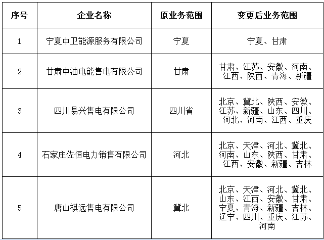 按照國(guó)家發(fā)改委、國(guó)家能源局《售電公司準(zhǔn)入與退出管理辦法》的要求,北京電力交易中心受理了下列售電公司的業(yè)務(wù)范圍變更申請(qǐng),對(duì)售電公司提交的變更申請(qǐng)材料進(jìn)行了完整性核驗(yàn),現(xiàn)將企業(yè)名單及有關(guān)情況予以公示。