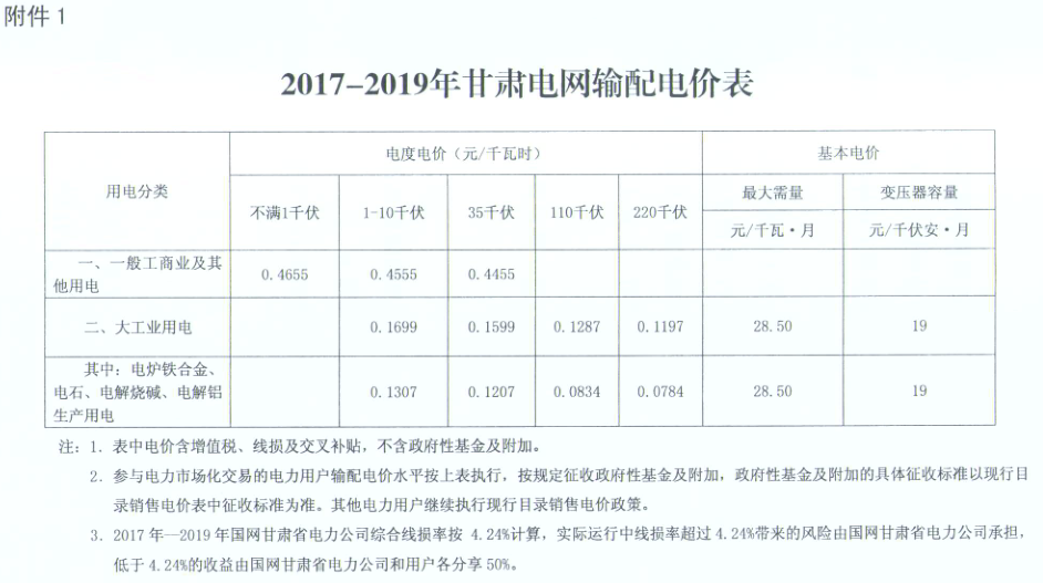 附件:1.2017-2019年甘肅電網(wǎng)輸配電價(jià)表