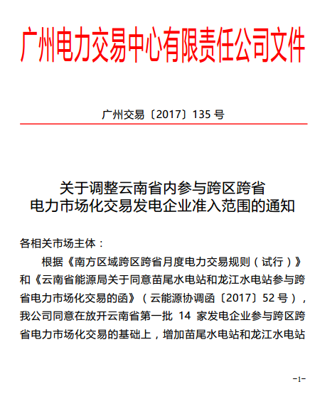 近日,廣州電力交易中心發(fā)布了《關(guān)于調(diào)整云南省內(nèi)參與跨區(qū)跨省電力市場化交易發(fā)電企業(yè)準入范圍的通知》,通知稱廣州電力交易公司同意在放開云南省第一批14家發(fā)電企業(yè)參與跨區(qū)跨省電力市場化交易的基礎(chǔ)上,增加苗