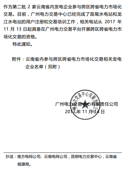 近日,廣州電力交易中心發(fā)布了《關(guān)于調(diào)整云南省內(nèi)參與跨區(qū)跨省電力市場化交易發(fā)電企業(yè)準入范圍的通知》,通知稱廣州電力交易公司同意在放開云南省第一批14家發(fā)電企業(yè)參與跨區(qū)跨省電力市場化交易的基礎(chǔ)上,增加苗尾水電站和龍江水電站作為第二批2家云南省內(nèi)發(fā)電企業(yè)參與跨區(qū)跨省電力市場化交易。目前,廣州電力交易中心已經(jīng)完成了苗尾水電站和龍江水電站的用戶注冊和交易培訓工作,相關(guān)電廠從2017年11月13日起具備在廣州電力交易平臺開展跨區(qū)跨省電力市場化交易的資格。