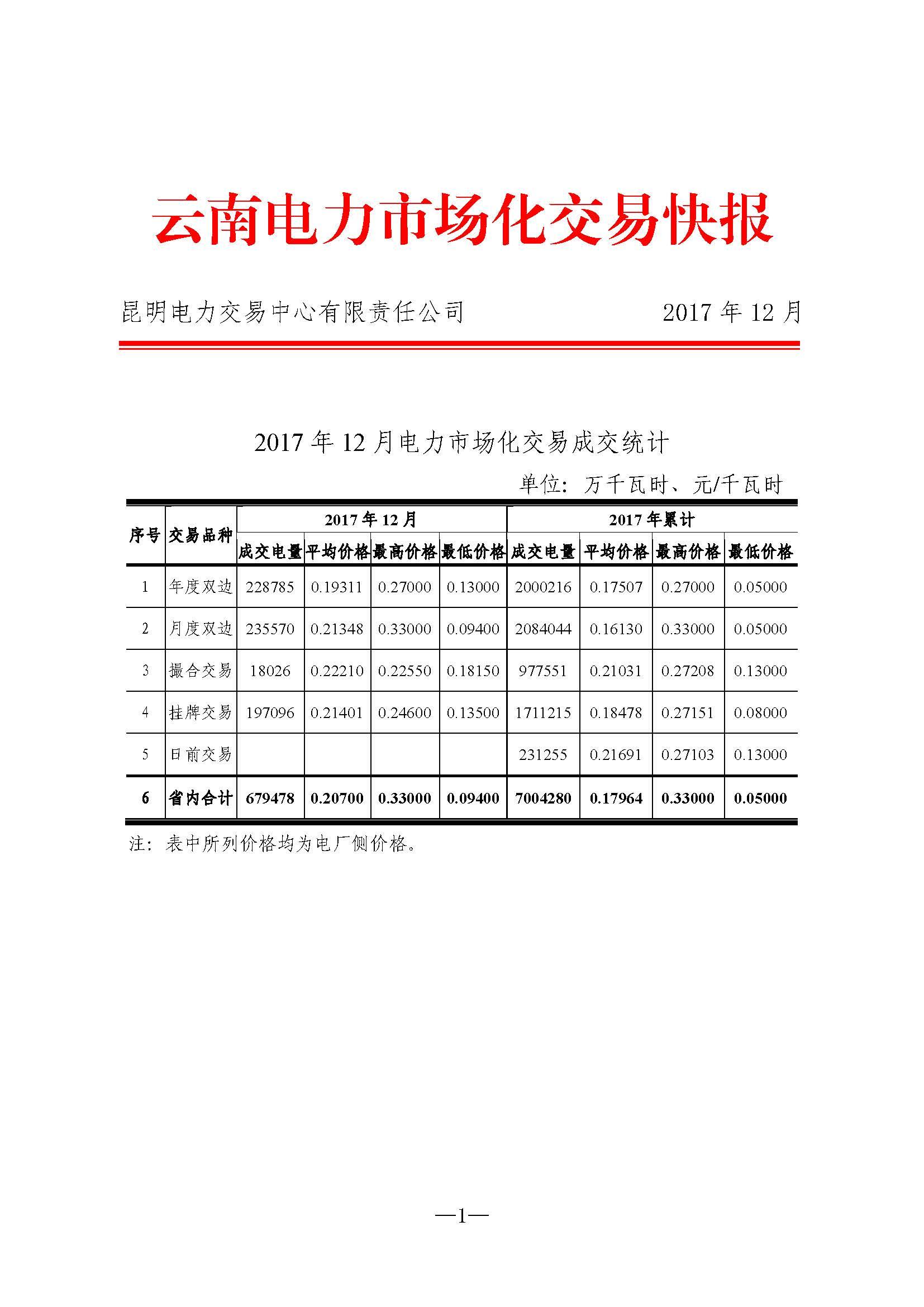 昆明電力交易中心發(fā)布2017年12月云南電力市場(chǎng)化交易快報(bào)