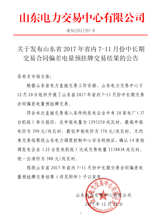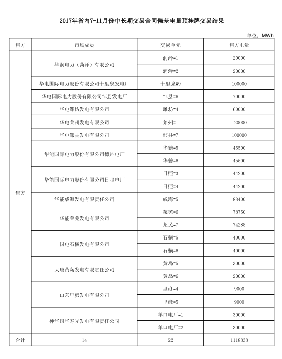 山東省2017年省內(nèi)7-11月份中長期交易合同偏差電量預掛牌交易結果:交易電量1118838兆瓦時
