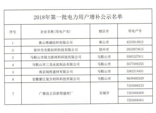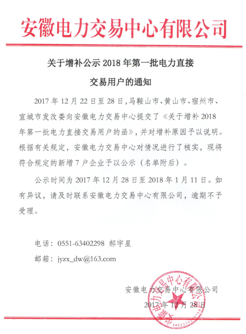 安徽增補(bǔ)公示2018年第一批電力直接交易用戶