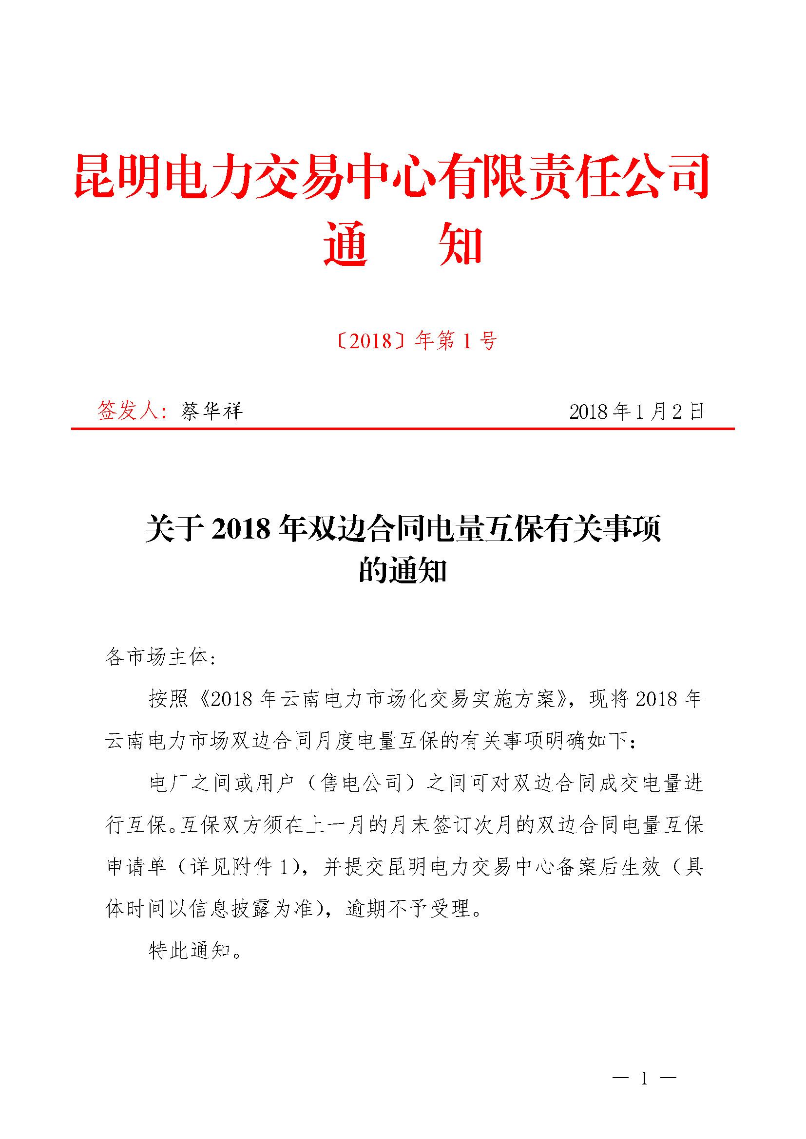 2018年1月3日,云南省昆明電力交易中心發(fā)布《關于2018年雙邊合同電量互保有關事項的通知》,電廠之間或用戶(售電公司)之間可對雙邊合同成交電量進行互保。互保雙方須在上一月的月末簽訂次月的雙邊合同電量互保申請單,并提交昆明電力交易中心備案后生效(具體時間以信息披露為準),逾期不予受理。 原文如下: