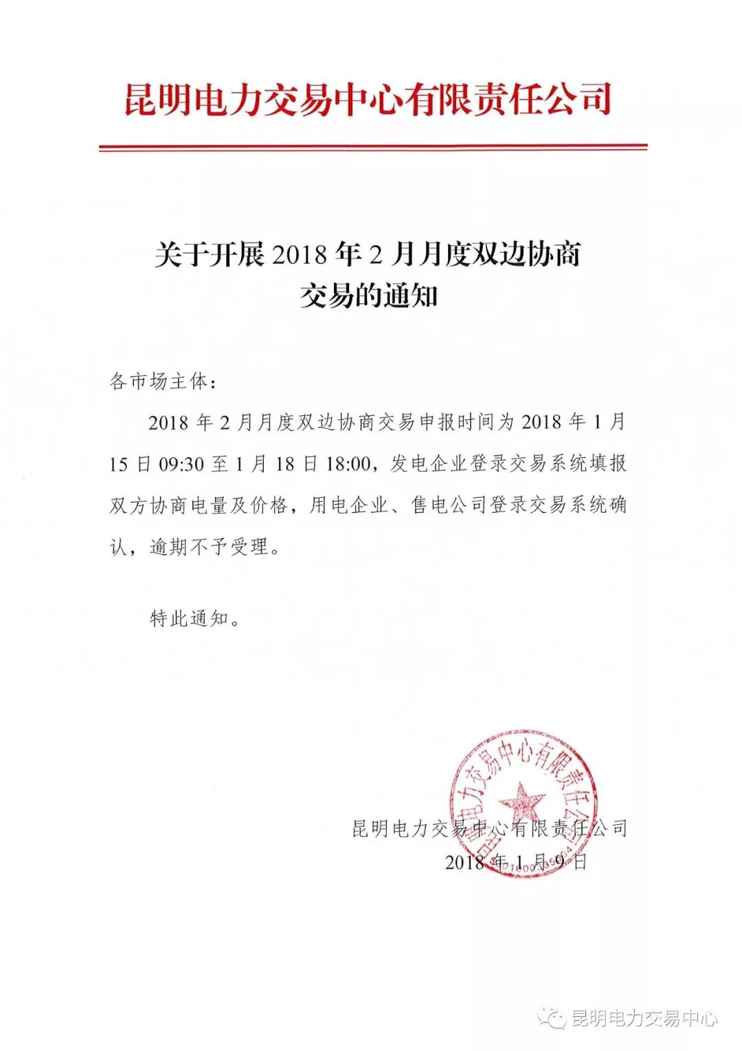 昆明電力交易中心日前發(fā)布了《關(guān)于開(kāi)展2018年2月月度雙邊協(xié)商交易的通知》,通知中稱,2018年2月月度雙邊協(xié)商交易申報(bào)時(shí)間為2018年1月15日9