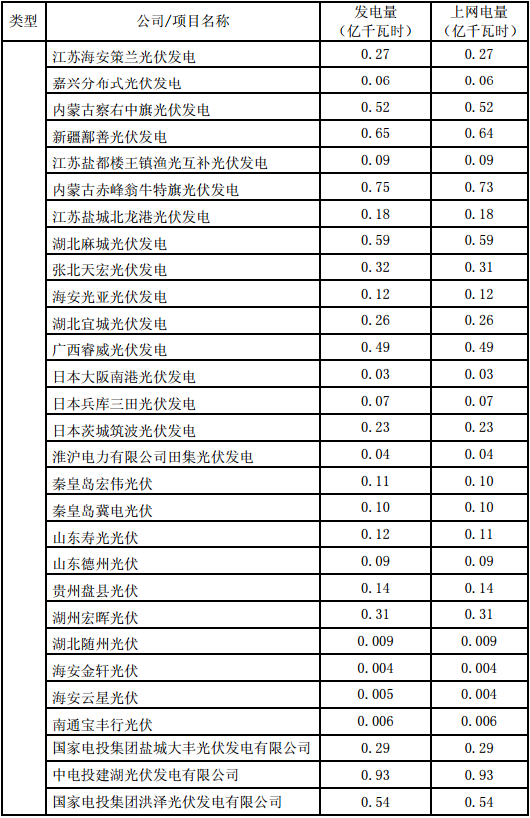 (1)新增新能源控股裝機(jī)容量44.62萬千瓦:湖北隨州光伏投產(chǎn)新增1.08萬千瓦,湖北孝感光伏投產(chǎn)新增4萬千瓦,山東鄆城光伏投產(chǎn)新增3萬千瓦,漕涇移動(dòng)式光伏投產(chǎn)新增2萬千瓦,湖南華容一期光伏投產(chǎn)新增4萬千瓦,湖南華容二期光伏投產(chǎn)新增4萬千瓦,廣西武鳴光伏投產(chǎn)新增5萬千瓦,河南萬邦光伏投產(chǎn)新增6萬千瓦,湖北荊門光伏投產(chǎn)新增3.38萬千瓦,湖北當(dāng)陽光伏投產(chǎn)新增4萬千瓦,山東海陽光伏投產(chǎn)新增1.9萬千瓦,海安濱海產(chǎn)業(yè)園光伏投產(chǎn)新增1.085萬千瓦,海安金軒光伏投產(chǎn)新增0.661萬千瓦,海安云星光伏投產(chǎn)新增0.678萬千瓦,宿遷泗洪光伏投產(chǎn)新增2.04萬千瓦,湖南漣源光伏投產(chǎn)新增1.8萬千瓦。