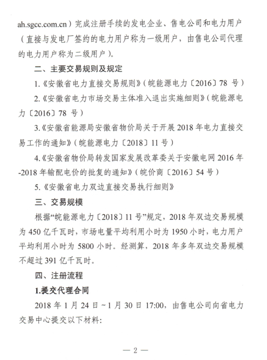 《安徽省2018年度電力雙邊直接交易的市場(chǎng)公告》