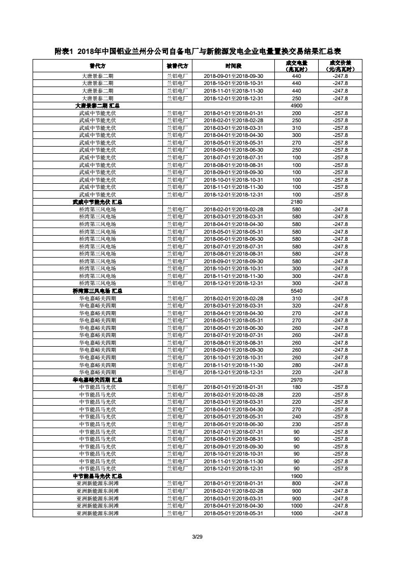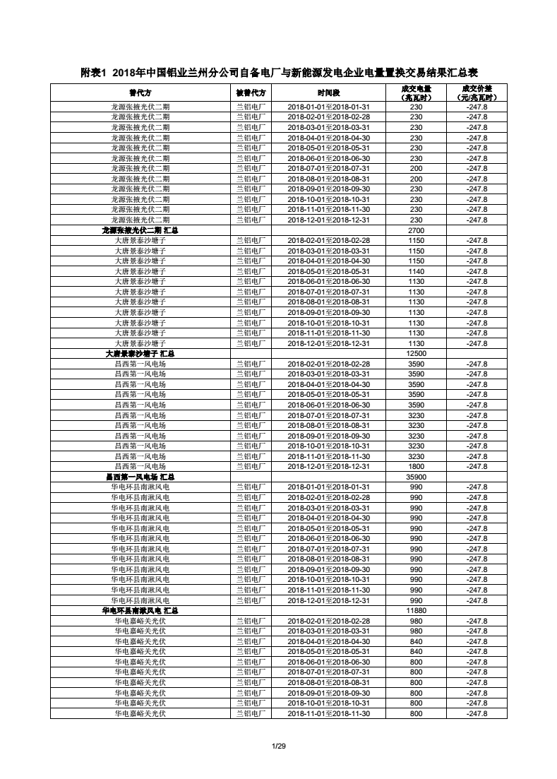 《附表1 2018年中國鋁業(yè)蘭州分公司自備電廠與新能源發(fā)電企業(yè)電量置換交易結(jié)果匯總表(18億) 》