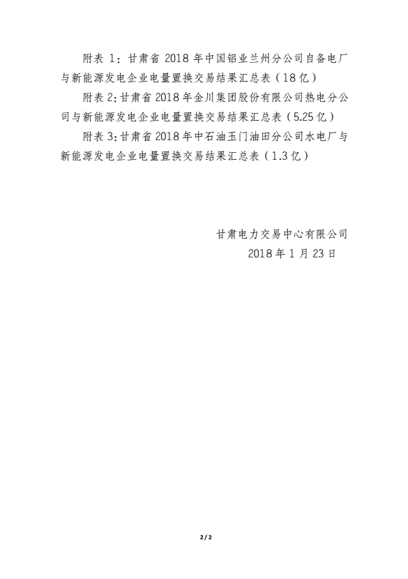 《2018年甘肅蘭鋁、金川集團、玉門石油自備電廠與新能源發(fā)電企業(yè)電量置換交易結(jié)果公告(2018年1月23日)》