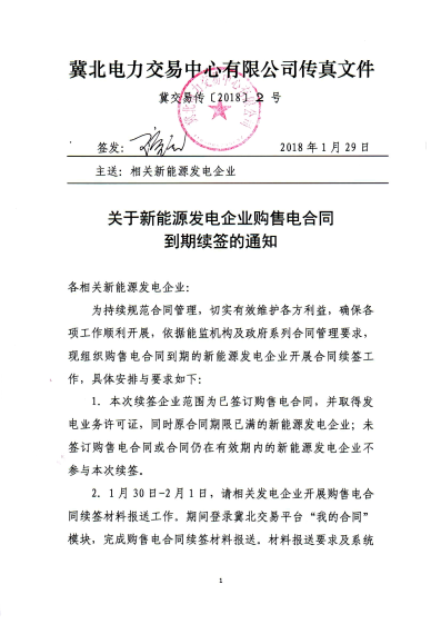 《冀交易傳【2018】02號(hào)關(guān)于新能源發(fā)電企業(yè)購售電合同到期續(xù)簽的通知》