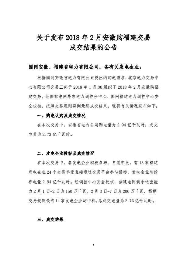 2018年2月安徽購(gòu)福建跨省集中交易結(jié)果:成交電量為2.73億千瓦時(shí)