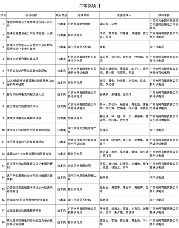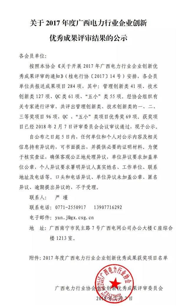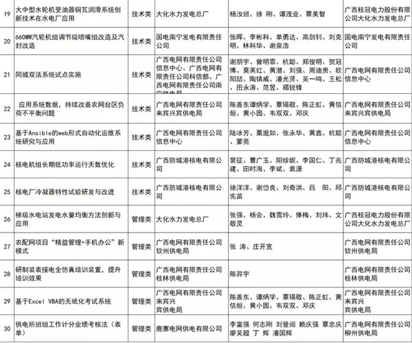 近日,廣西電力行業(yè)協(xié)會公示電力行業(yè)企業(yè)創(chuàng)新優(yōu)秀成果評審結(jié)果,報送成果項目284項,共評出管理創(chuàng)新類、技術(shù)創(chuàng)新類一、二、三等獎項目96項,QC、“五小”類項目優(yōu)秀獎69項,合計165項。詳細情況如下: