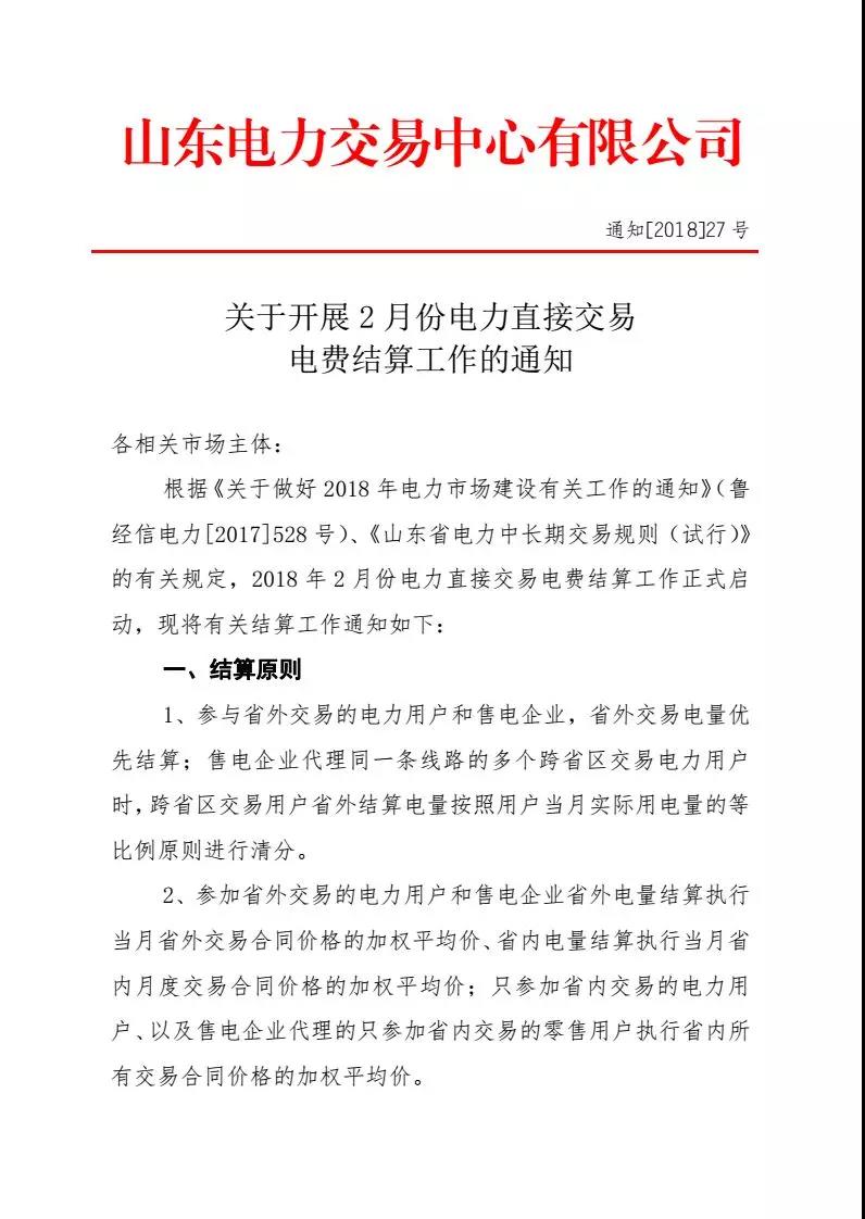 根據(jù)《關(guān)于做好2018年電力市場(chǎng)建設(shè)有關(guān)工作的通知》(魯經(jīng)信電力[2017]528號(hào))、《山東省電力中長(zhǎng)期交易規(guī)則(試行)》的有關(guān)規(guī)定,2018年2月份電力直接交易電費(fèi)結(jié)算工作正式啟動(dòng),現(xiàn)將有關(guān)結(jié)算工作通知如下: