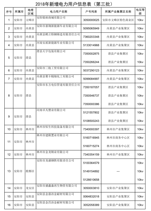 2018年河南省新增電力用戶名單公示 ( 第 三 批 )