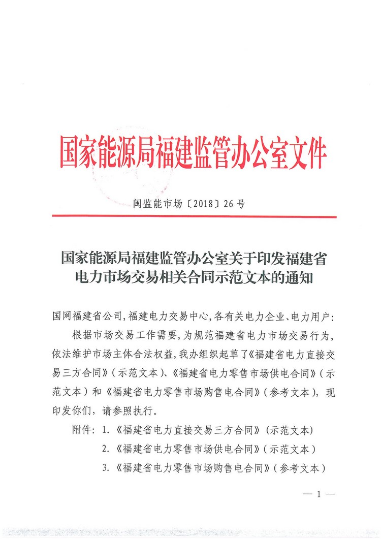 國(guó)家能源局福建監(jiān)管辦日前發(fā)布了《福建省電力市場(chǎng)交易相關(guān)合同示范文本的通知》,其中包含《福建省電力直接交易三方合同》(示范文本)、《福建省電力零售市場(chǎng)供電合同》(示范文本)、《福建省電力零售市場(chǎng)購(gòu)售電合同》(參考文本)。