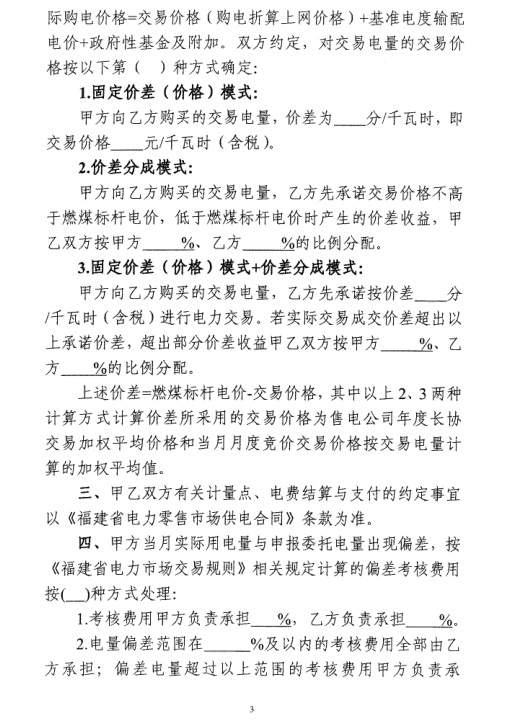 國(guó)家能源局福建監(jiān)管辦日前發(fā)布了《福建省電力市場(chǎng)交易相關(guān)合同示范文本的通知》,其中包含《福建省電力直接交易三方合同》(示范文本)、《