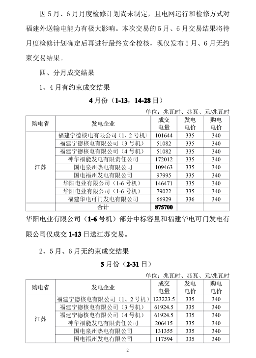 4月份最終成交8.757億千瓦時,1家核電企業(yè)、5家火電企業(yè)中標(biāo)。5、6月份交易結(jié)果將待月度檢修計劃確定后再進行最終安全校核。
