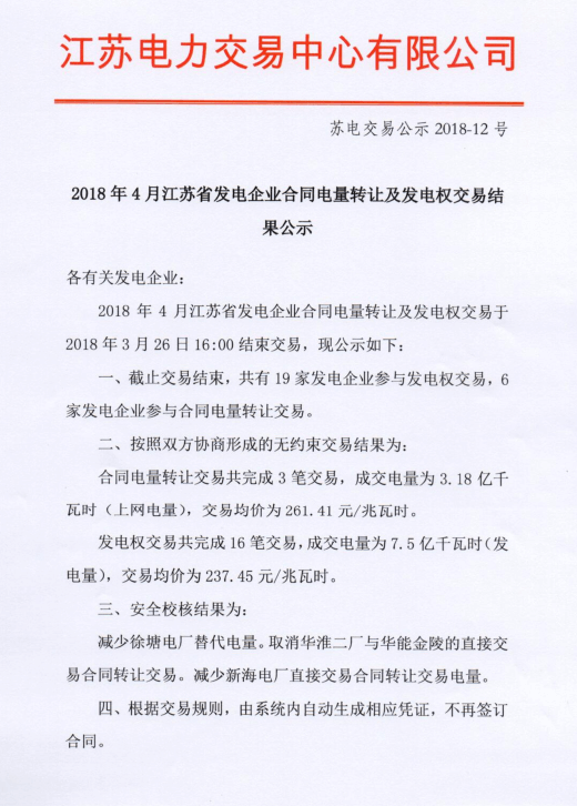 2018年4月江蘇省發(fā)電企業(yè)合同電量轉(zhuǎn)讓及發(fā)電權(quán)交易結(jié)果