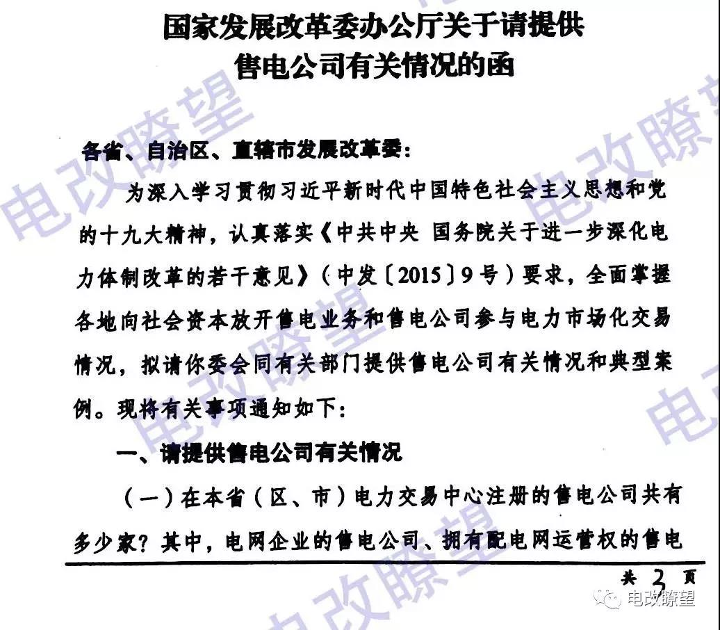 據(jù)電改瞭望微信號,國家發(fā)改委辦公廳日前發(fā)布了《關(guān)于請?zhí)峁┦垭姽居嘘P(guān)情況的函》,要求提供在本省電力交易中心注冊的售電公司共有多少家